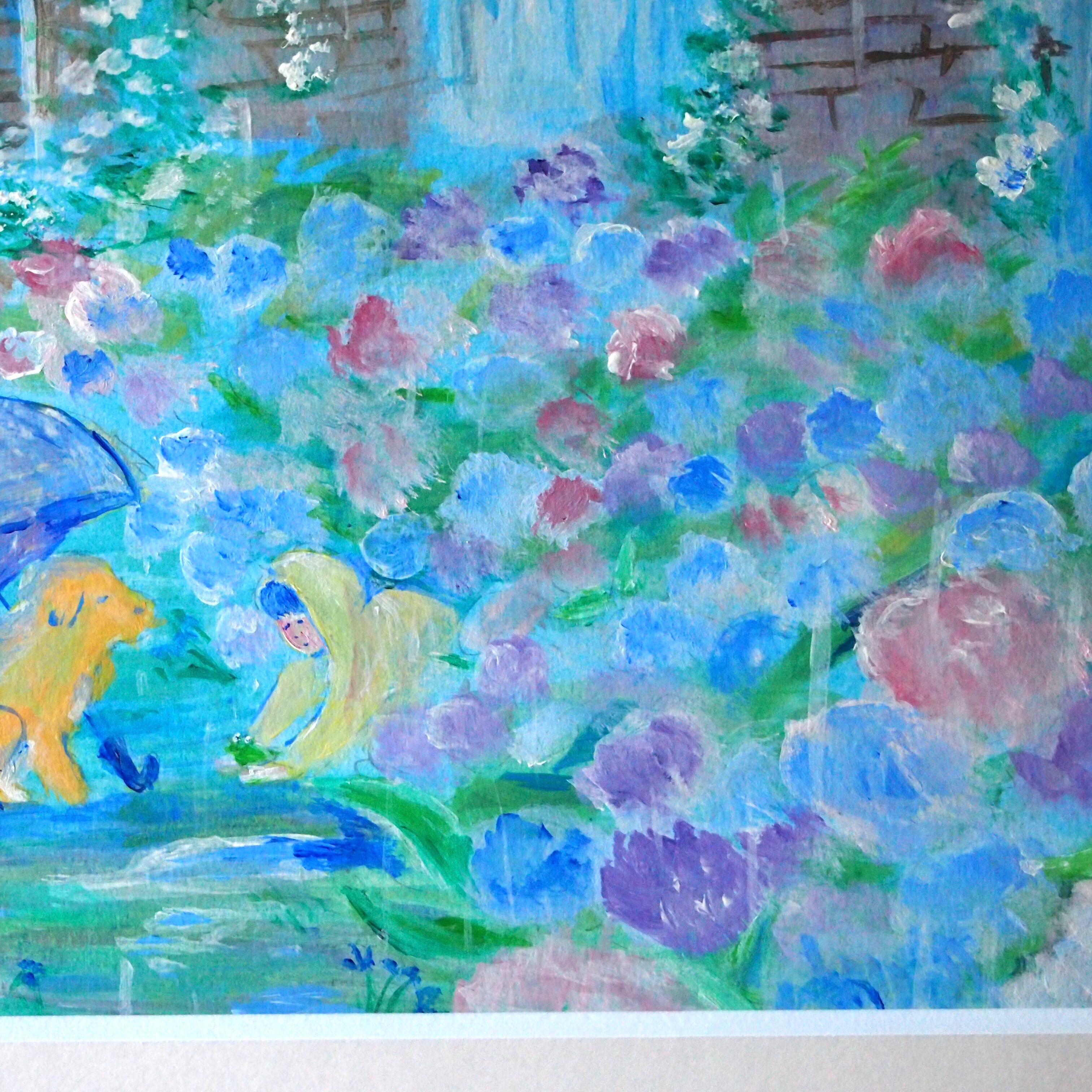 雨がしとしとと降り、アジサイの咲く中、少年と犬とかえるはなにをしているのでしょうか?